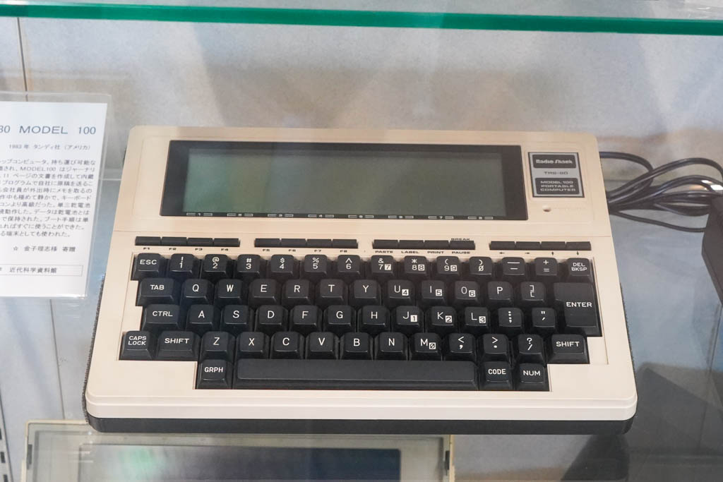 1983年に発売された「TRS-80 Model 100」は、ノートPCの先駆けとなった歴史的名機です。NECのPC-8201とは基本設計を共有する兄弟機であり、ハードウェア構成はほぼ同一です。単3電池で駆動し、優れたキーボードと内蔵モデムを備えていたため、場所を選ばず執筆できる記者用端末として世界中で重宝されました。現代のモバイルコンピューティングの原点ともいえる一台です。