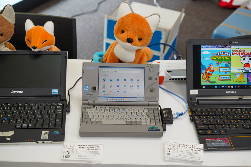 「おーぷんここん」は、旧型PCに軽量Linuxを入れシンクライアント端末として利用できるようにするプロジェクトです。Librettoで最新ブラウザを動かす(見せる)デモを実施しています。Libretto懐かしいですね!
